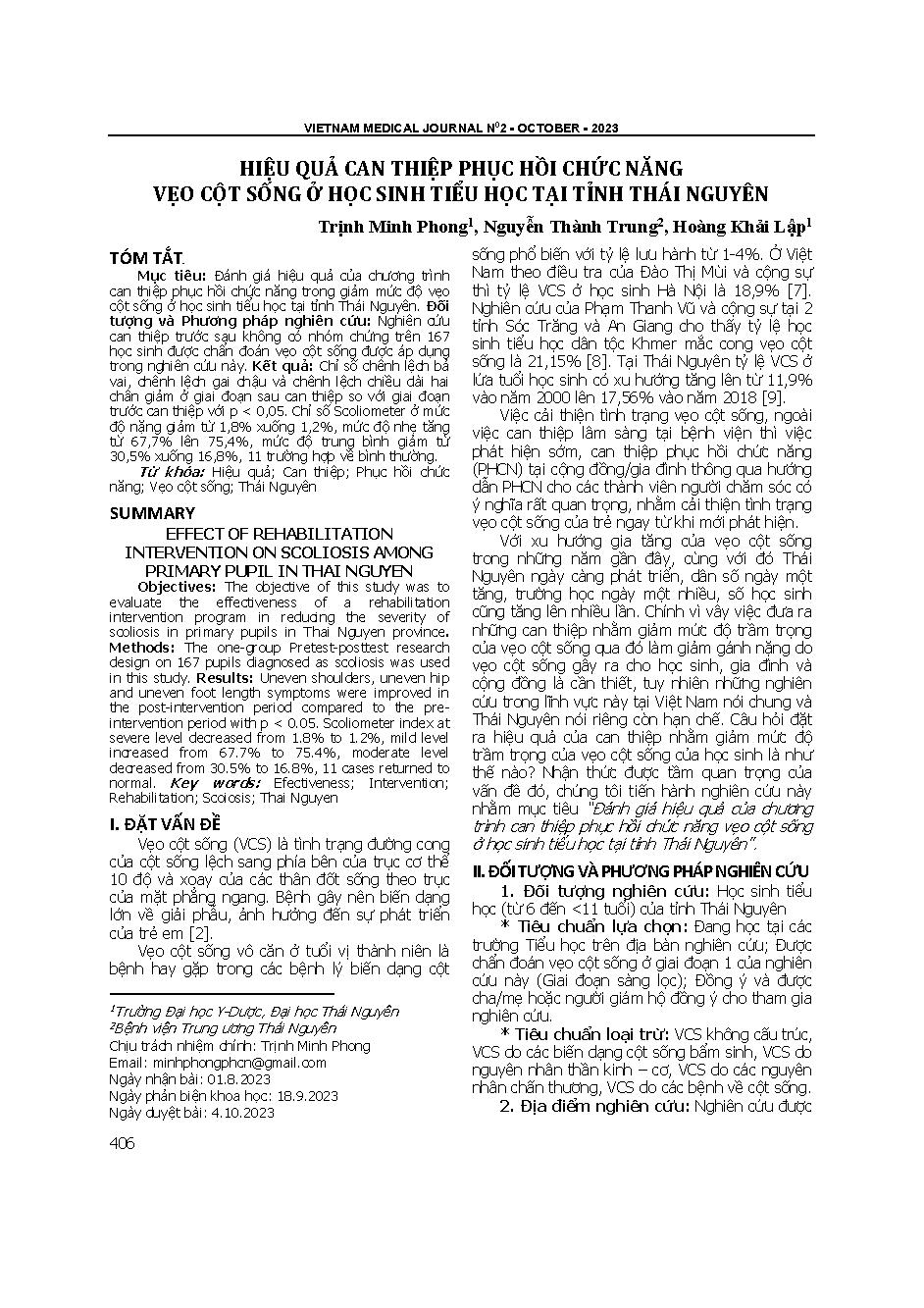 Hiệu quả can thiệp phục hồi chức năng vẹo cột sống ở học sinh tiểu học tại tỉnh Thái Nguyên = Effect of rehabilitation intervention on scoliosis among primary pupil in Thai Nguyen