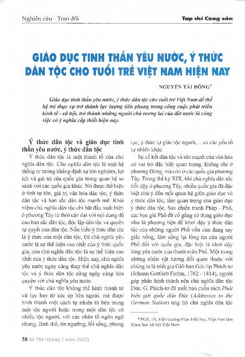 Giáo dục tinh thần yêu nước, ý thức dân tộc cho tuổi trẻ Việt Nam hiện nay = Educating patriotism and national consciousness for Vietnamese youth today