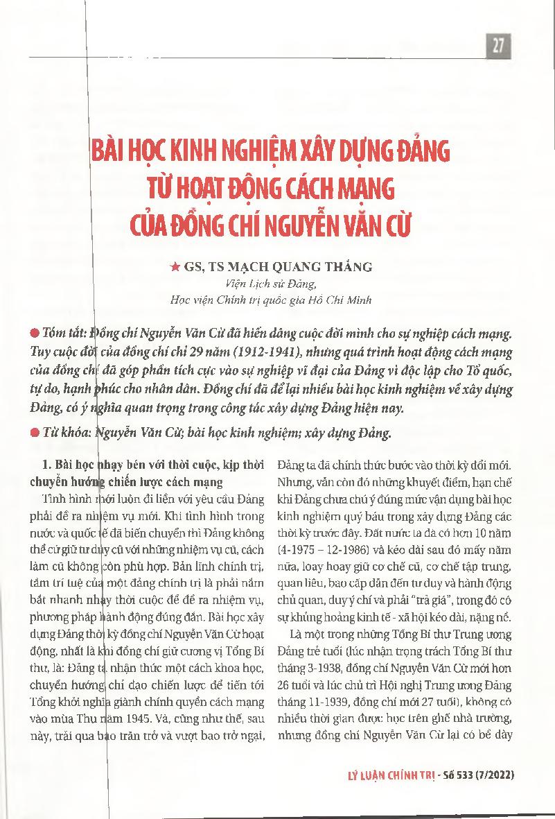 Bài học kinh nghiệm xây dựng Đảng từ hoạt động cách mạng của đồng chí Nguyễn Văn Cừ