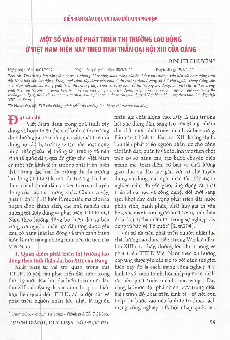 Một số vấn đề phát triển thị trường lao động ở Việt Nam hiện nay theo tinh thần đại hội XIII của Đảng