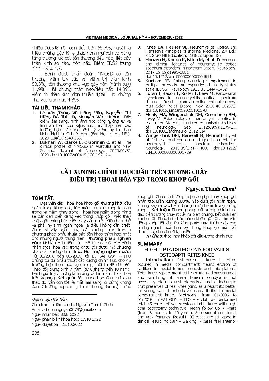 Cắt xương chỉnh trục đầu trên xương chày điều trị thoái hóa vẹo trong khớp gối = High tibia osteotomy for varus osteoarthritis knee