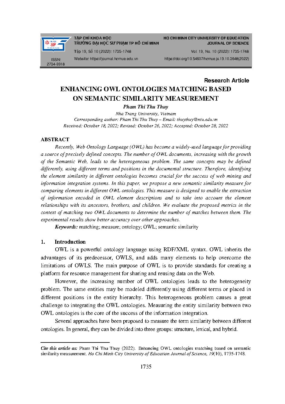 Nâng cao sự so khớp giữa các tài liệu ontologies dựa vào đánh giá độ tương đồng về ngữ nghĩa = Enhancing owl ontologies matching based on semantic similarity measurement