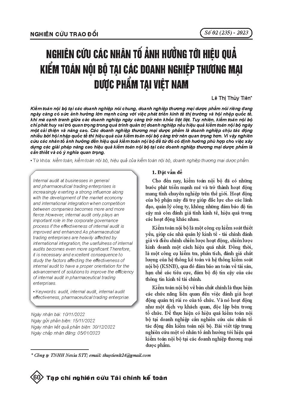 Nghiên cứu các nhân tố ảnh hưởng tới hiệu quả kiểm toán nội bộ tại các doanh nghiệp thương mại dược phẩm tại Việt Nam = Research of factors affecting the efficiency of internal audit at pharmaceutical trade enterprise in Vietnam