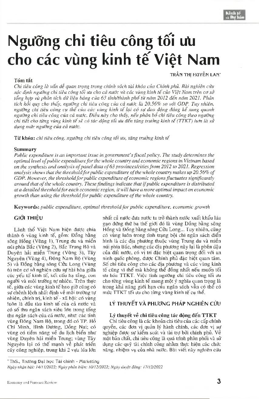 Ngưỡng chi tiêu công tối ưu cho các vùng kinh tế Việt Nam = Optimal threshold for public expenditure of Vietnam’s economic regions