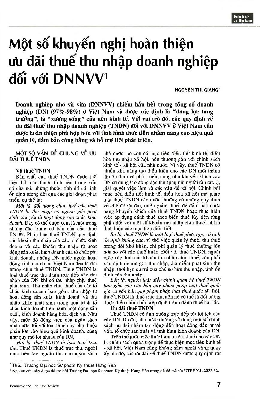 Một số khuyến nghị hoàn thiện ưu đãi thuế thu nhập doanh nghiệp đối với DNNVV