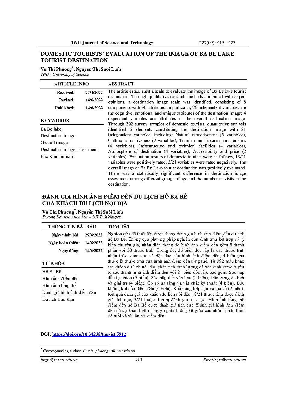 Đánh giá hình ảnh điểm đến du lịch hồ ba bể của khách du lịch nội địa = Domestic tourists’ evaluation of the image of ba be lake tourist destination