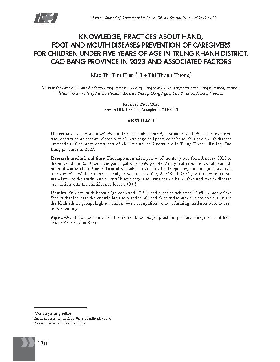 Kiến thức, thực hành và một số yếu tố liên quan đến phòng bệnh tay chân miệng của người chăm sóc chính trẻ dưới 5 tuổi tại huyện Trùng Khánh, tỉnh Cao Bằng năm 2023 = Knowledge, practices about hand, foot and mouth diseases prevention of caregivers for ch
