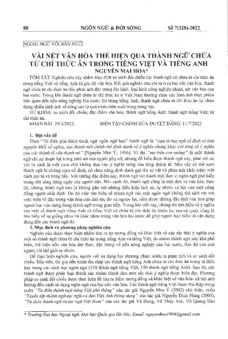Vài nét văn hóa thể hiện qua thành ngữ chứa từ chỉ thức ăn trong tiếng Việt và tiếng Anh = Cultural characteristics revealed through English and Vietnamese idioms containing words denoting food