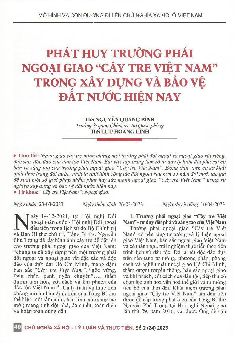 Phát huy trường phái ngoại giao "Cây tre Việt Nam" trong xây dựng và bảo vệ đất nước hiện nay = Promoting the diplomatic style of "Vietnamese Bamboo" in the current national construction and defense