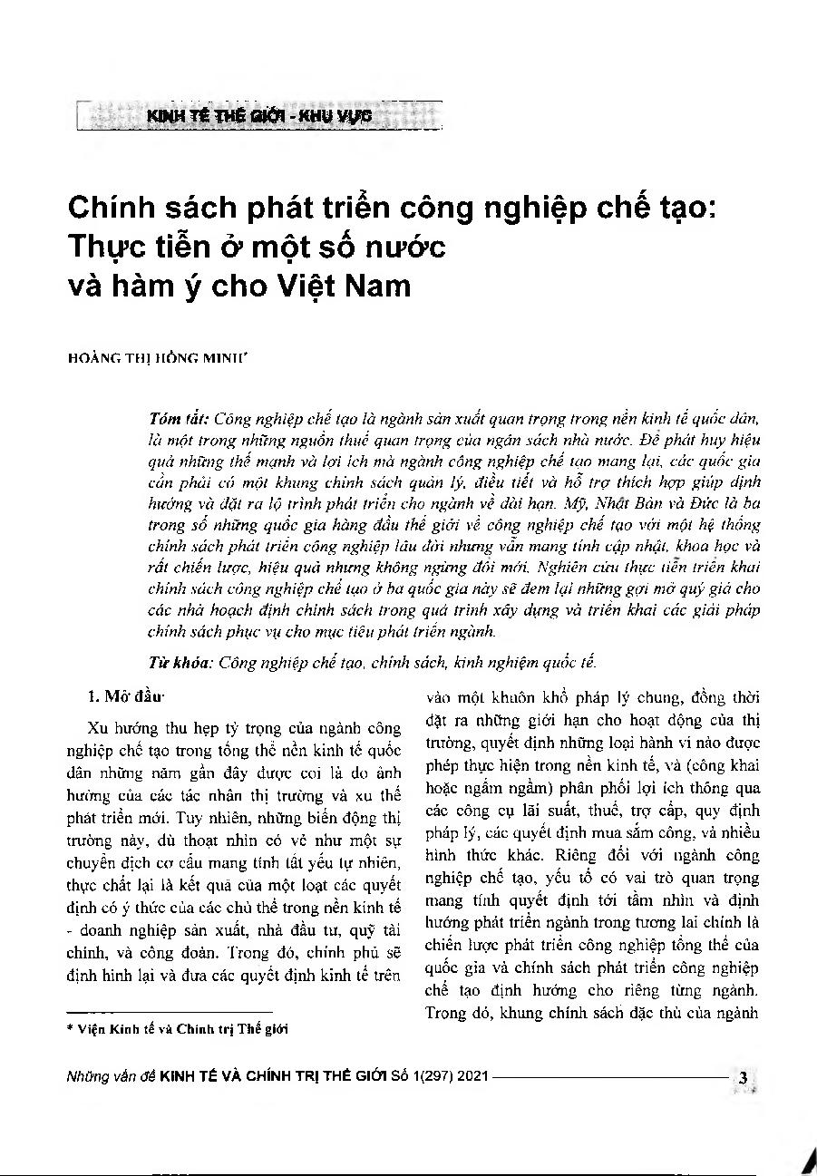 Chính sách phát triển công nghiệp chế tạo: Thực tiễn ở một số nước và hàm ý cho Việt Nam = Manufacturing industry development policy: Practices in some countries and implications for Vietnam