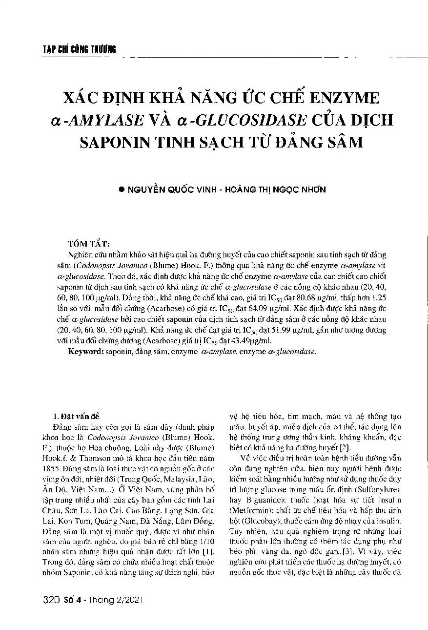 Xác định khả năng ức chế enzyme α-amylase và α-glucosidase của dịch saponin tinh sạch từ đảng sâm = Determining the inhibition of saponin extracted from the Codonopsis Javanica against the enzymes a-amylase and a-glucosidase
