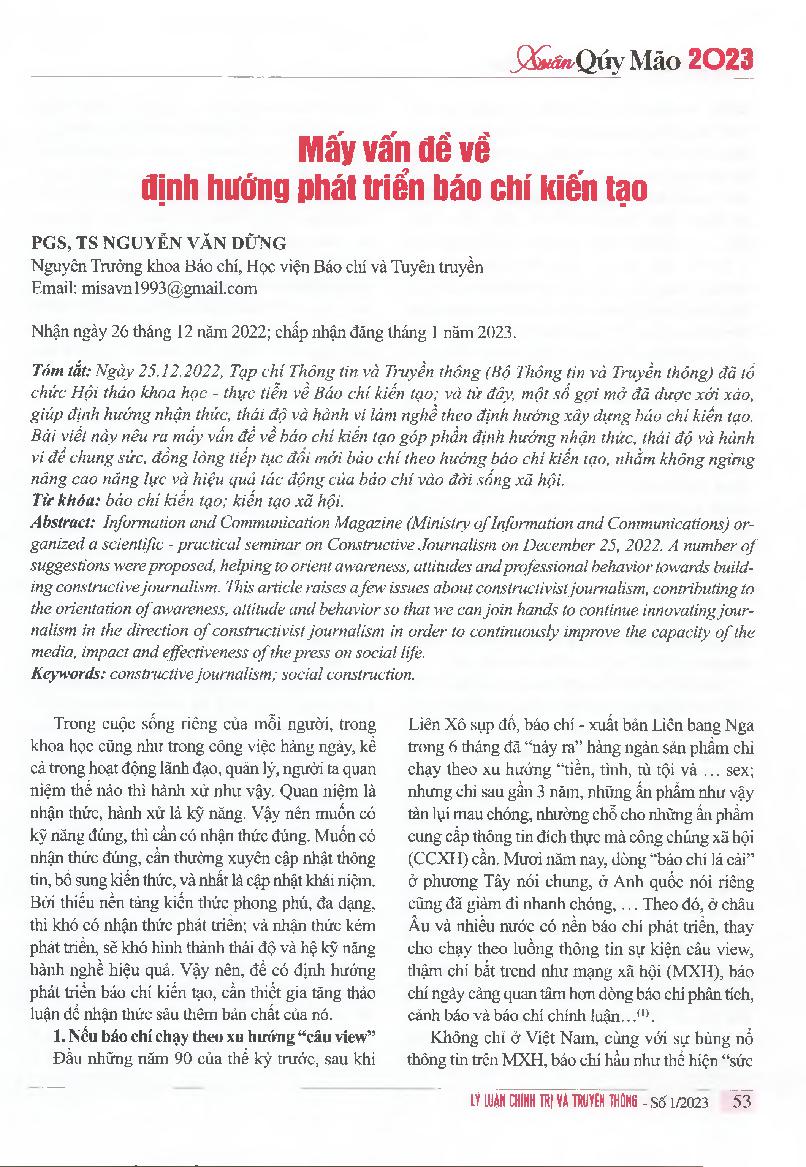 Mấy vấn đề về định hướng phát triển báo chí kiến tạo = Orientations to develop constructivist journalism