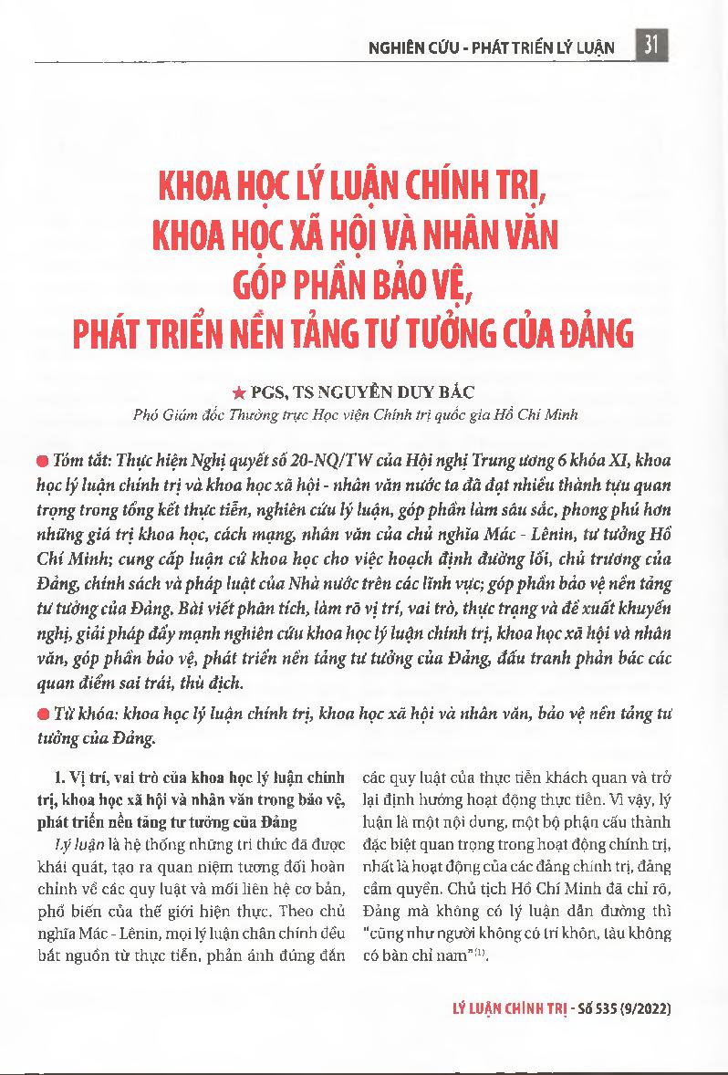 Khoa học lý luận chính trị, khoa học xã hội và nhân văn góp phần bảo vệ, phát triển nền tảng tư tưởng của Đảng = Political science, social science and humanities contribute to protecting and developing the Party&; 39;s ideological foundation