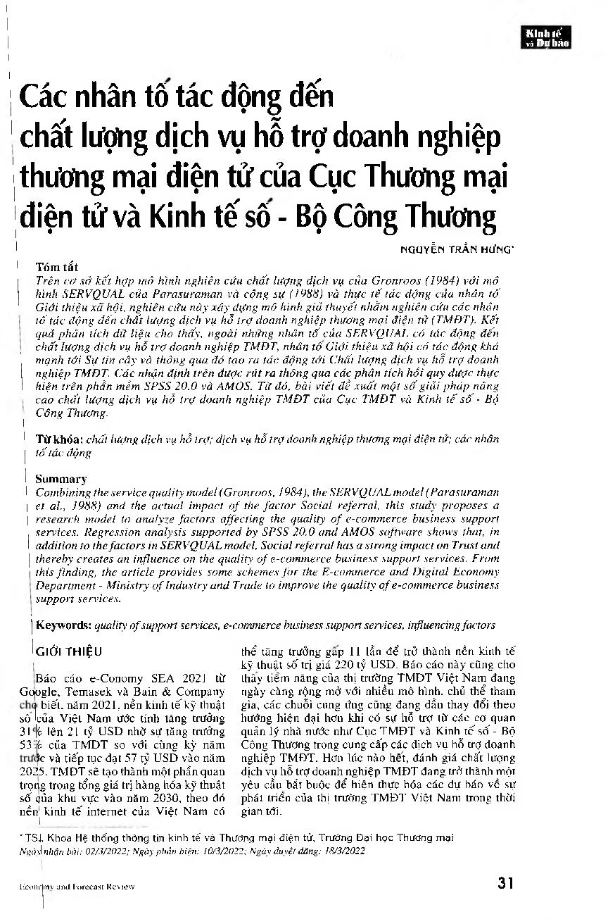 Các nhân tố tác động đến chất lượng dịch vụ hỗ trợ doanh nghiệp thương mại điện tử của Cục Thương mại điện tử và Kinh tế số - Bộ Công Thương = Factors affecting the quality of e-commerce business support services of E-commerce and Digital Economy Departme