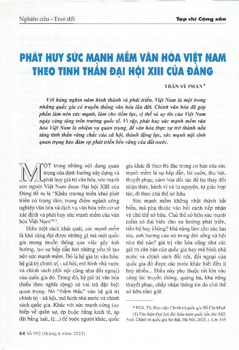 Phát huy sức mạnh mềm văn hóa Việt Nam theo tinh thần Đại hội XIII của Đảng = Promoting the soft power of Vietnamese culture in the spirit of the 13th Party Congress