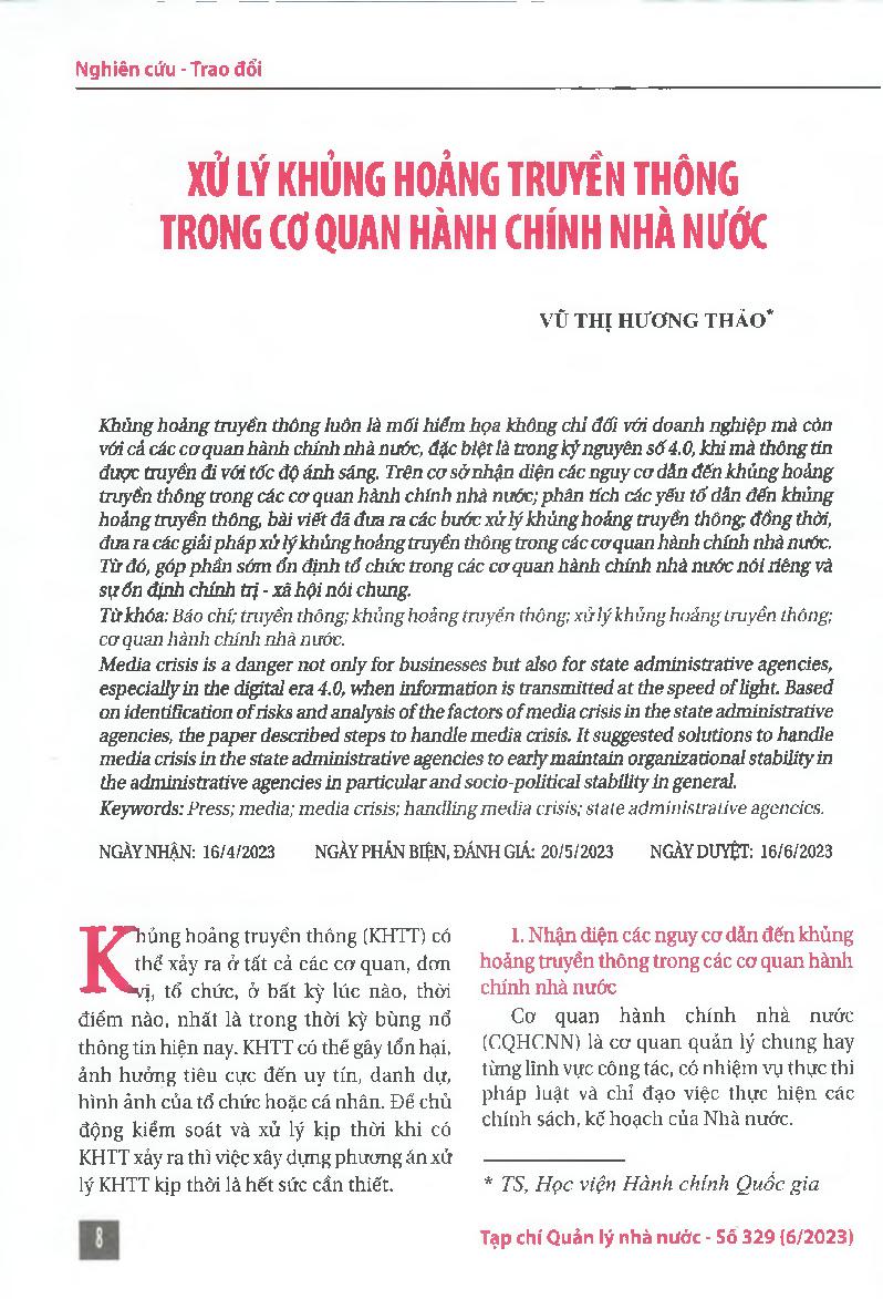 Xử lý khủng hoảng truyền thông trong cơ quan hành chính nhà nước = Handling communication crises in state administrative agencies
