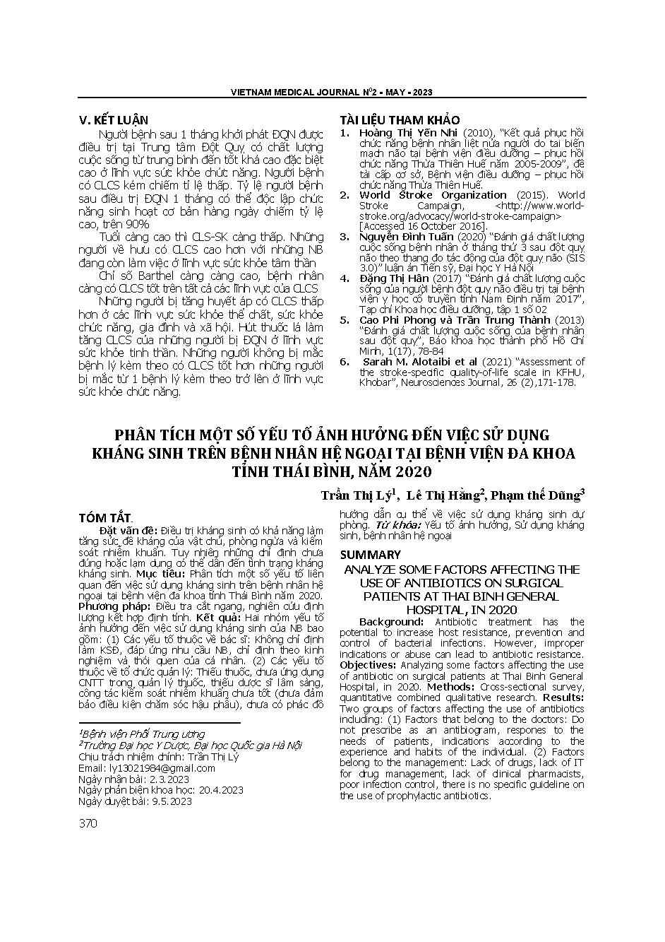 Phân tích một số yếu tố ảnh hưởng đến việc sử dụng kháng sinh trên bệnh nhân hệ ngoại tại Bệnh viện Đa khoa tỉnh Thái Bình, năm 2020 = Analyze some factors affecting the use of antibiotics on surgical patients at Thai Binh general hospital, in 2020