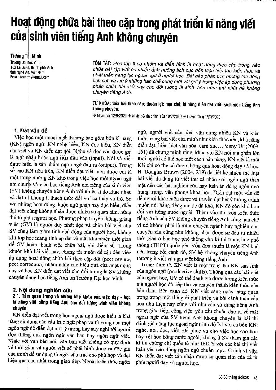Hoạt động chữa bài theo cặp trong phát triển kĩ năng viết của sinh viên tiếng Anh không chuyên = Using peer correction to improve writing performance for non - major English students