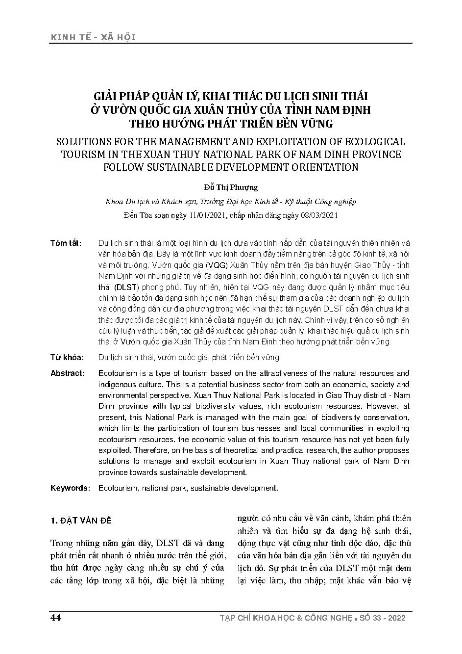 Giải pháp quản lý, khai thác du lịch sinh thái ở Vườn quốc gia Xuân Thủy của tỉnh Nam Định theo hướng phát triển bền vững = Solutions for the management and exploitation of ecological tourism in the Xuan Thuy national park of Nam Dinh province follow sust