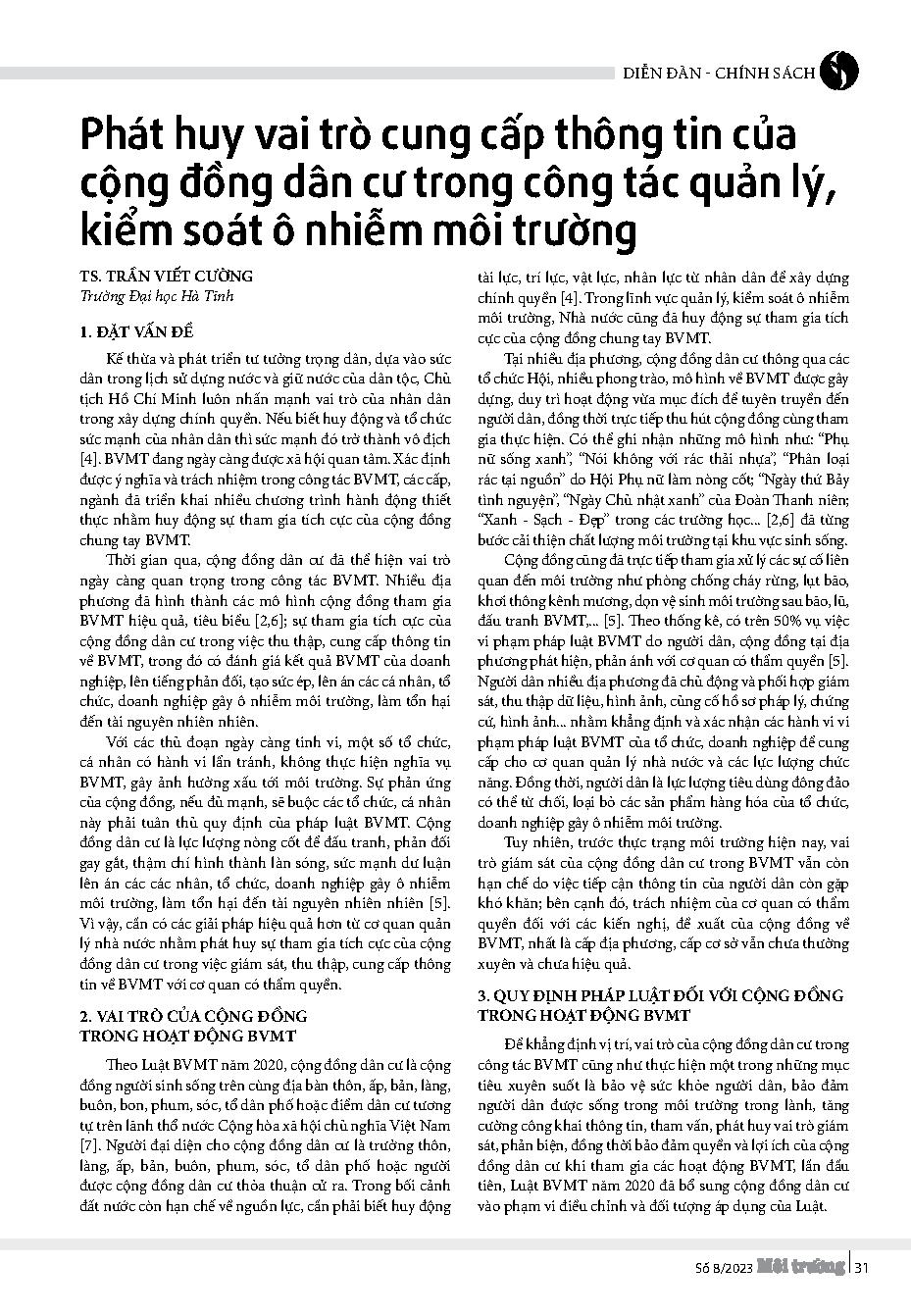 Phát huy vai trò cung cấp thông tin của cộng đồng dân cư trong công tác quản lý, kiểm soát ô nhiễm môi trường