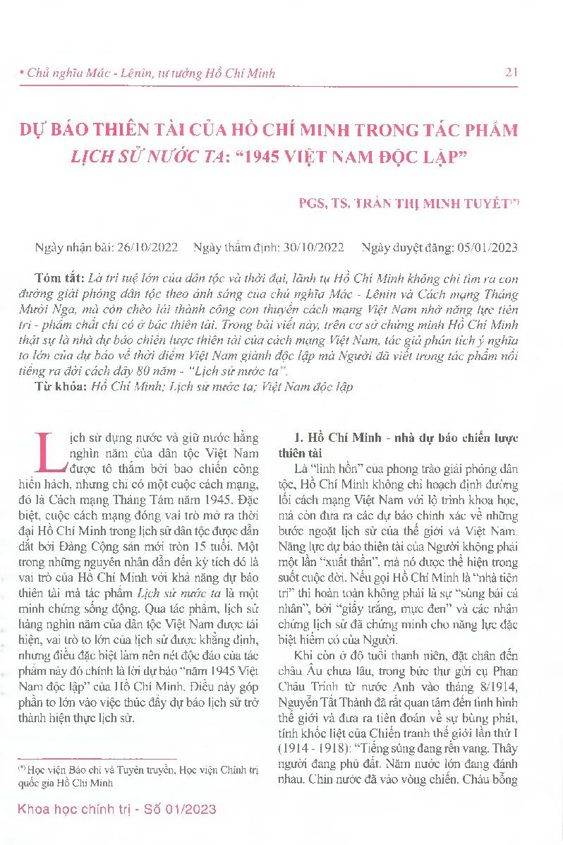 Dự báo thiên tài của Hồ Chí Minh trong tác phẩm Lịch sử nước ta: "1945 Việt Nam độc lập" = Ho Chi Minh's genius prediction in the work "our country's history": Vietnam will gain independence in 1945
