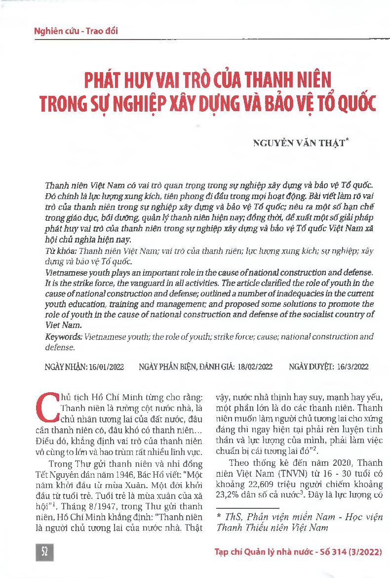 Phát huy vai trò của thanh niên trong sự nghiệp xây dựng và bảo vệ tổ quốc = Promoting the role of youth in the cause of national construction and defense
