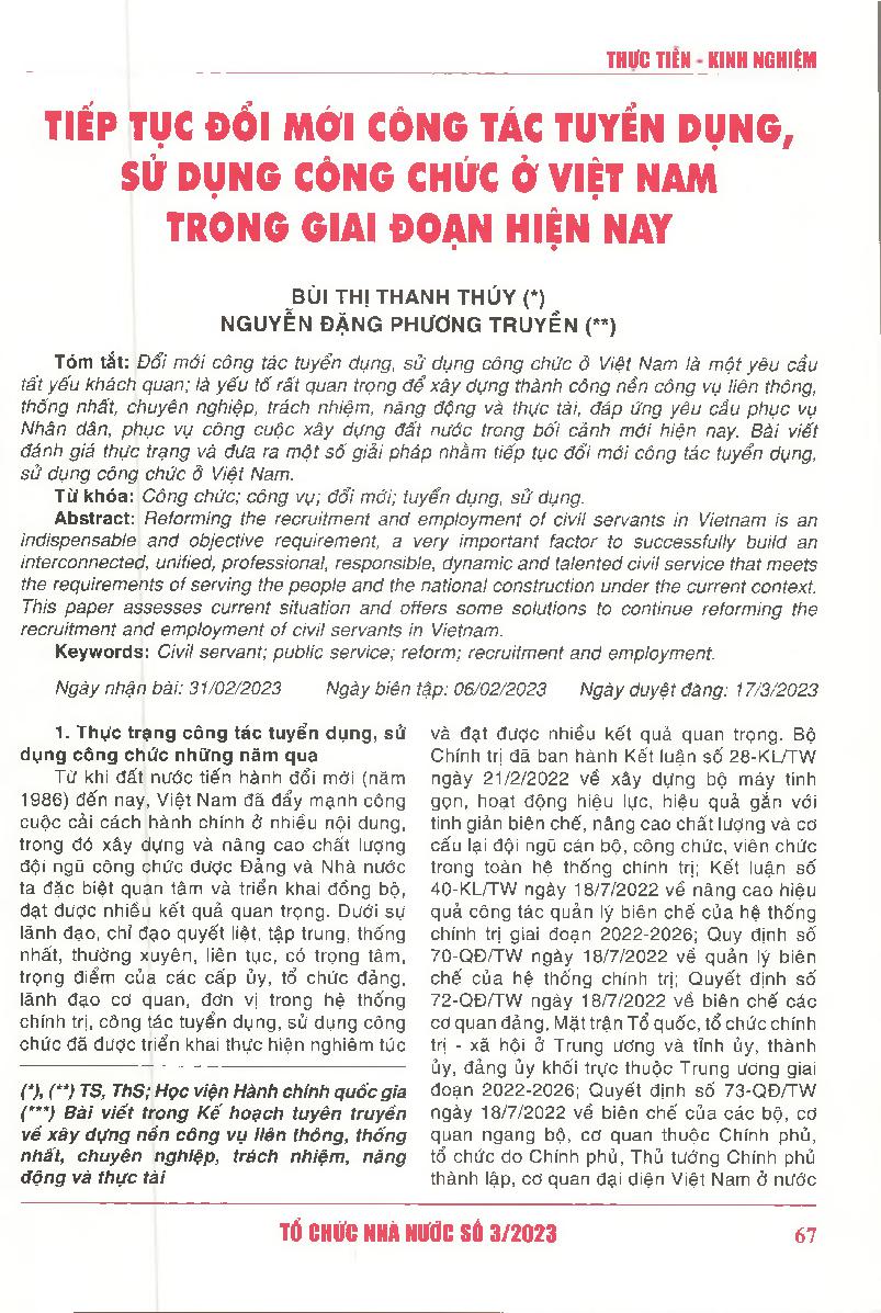 Tiếp tục đổi mới công tác tuyển dụng, sử dụng công chức ở Việt Nam trong giai đoạn hiện nay = Continue reforming the recruitment and employment of civil servants in Vietnam under the existing period