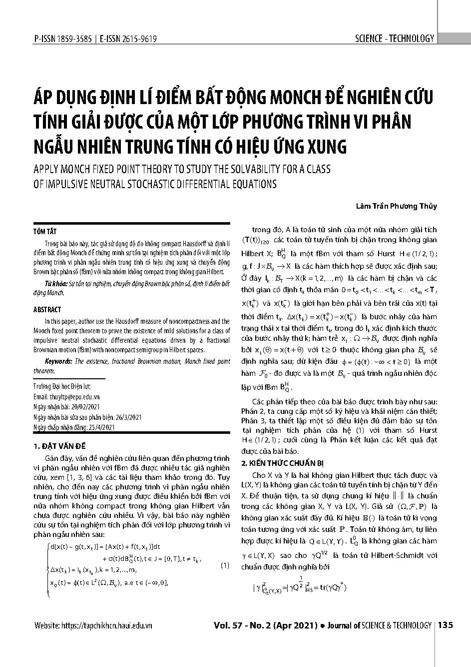 Áp dụng định lí điểm bất động monch để nghiên cứu tính giải được của một lớp phương trình vi phân ngẫu nhiên trung tính có hiệu ứng xung = Apply monch fixed point theory to study the solvability for a class of impulsive neutral stochastic differential equations