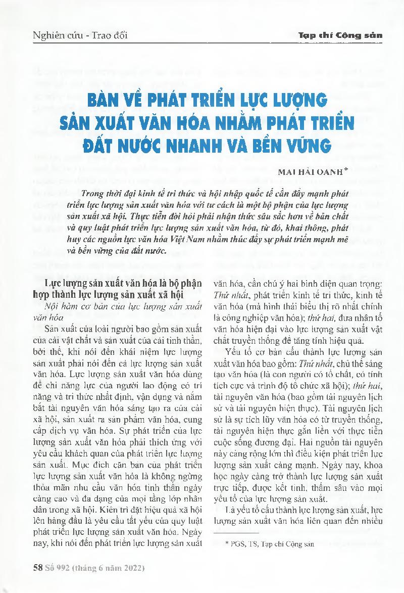 Bàn về phát triển lực lượng sản xuất văn hóa nhằm phát triển đất nước nhanh và bền vững = Discuss the development of cultural productive forces to develop the country quickly and sustainably