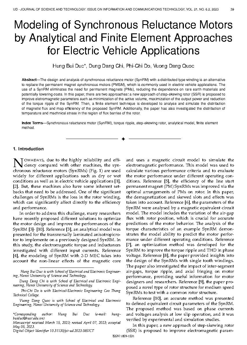 Mô hình hóa động cơ từ trở đồng bộ bằng phương pháp tiếp cận phần tử hữu hạn và phân tích cho các ứng dụng xe điện = Modeling of Synchronous Reluctance Motors by Analytical and Finite Element Approaches for Electric Vehicle Applications