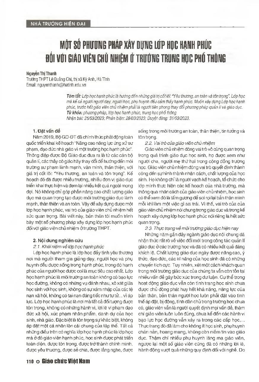 Một số phương pháp xây dựng lớp hạnh phúc đối với giáo viên chủ nhiệm ở trường trung học phổ thông = Some measures to build a happy classroom for the head teachers in high schools