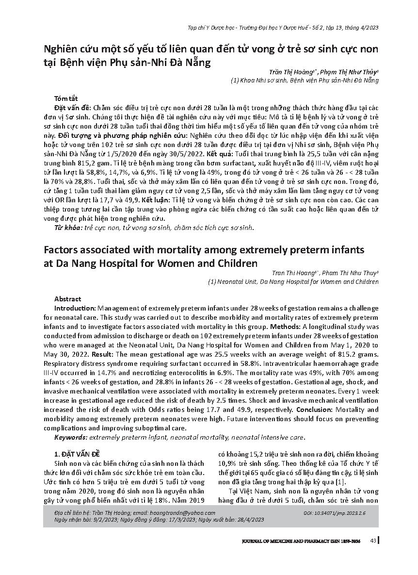 Nghiên cứu một số yếu tố liên quan đến tử vong ở trẻ sơ sinh cực non tại Bệnh viện Phụ sản-Nhi Đà Nẵng = Factors associated with mortality among extremely preterm infants at Da Nang Hospital for Women and Children