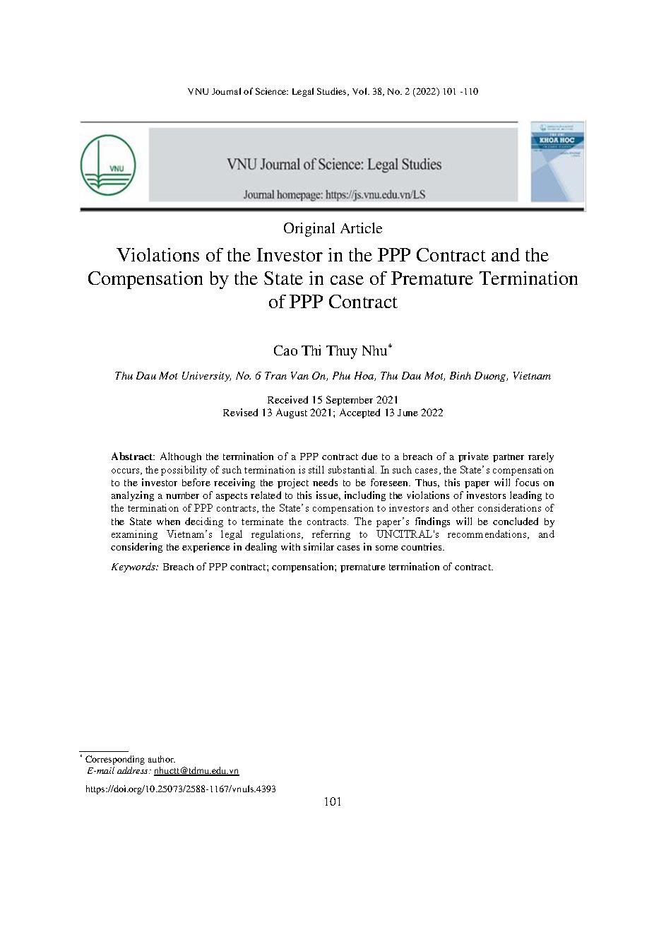 Vi phạm của nhà đầu tư trong hợp đồng PPP và vấn đề bồi thường của Nhà nước khi chấm dứt hợp đồng PPP trước hạn = Violations of the investor in the PPP contract and the compensation by the state in case of premature termination of PPP contract