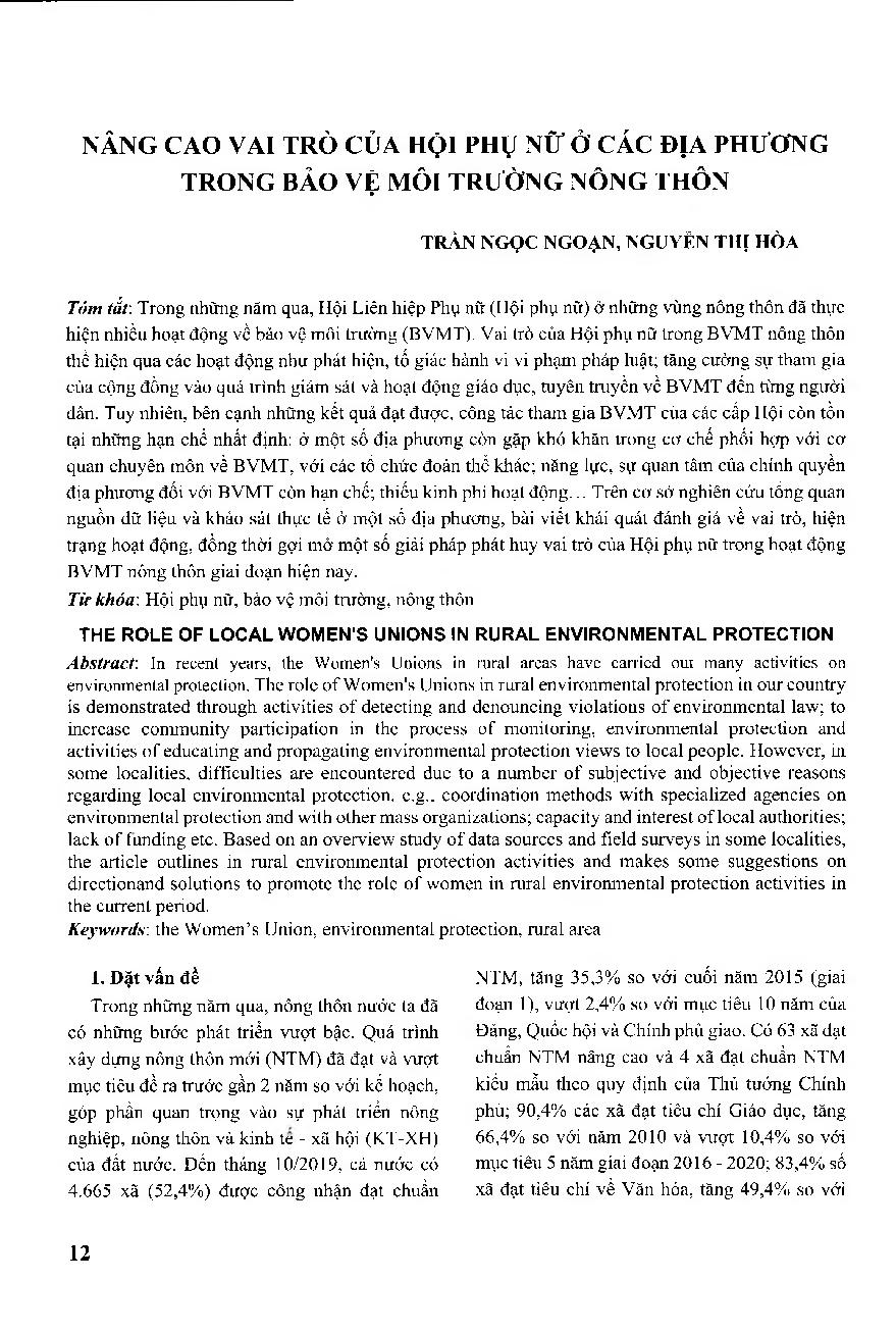 Nâng cao vai trò của hội phụ nữ ở các địa phương trong bảo vệ môi trường nông thôn = The role of local women&; 39;s unions in rural environmental protection