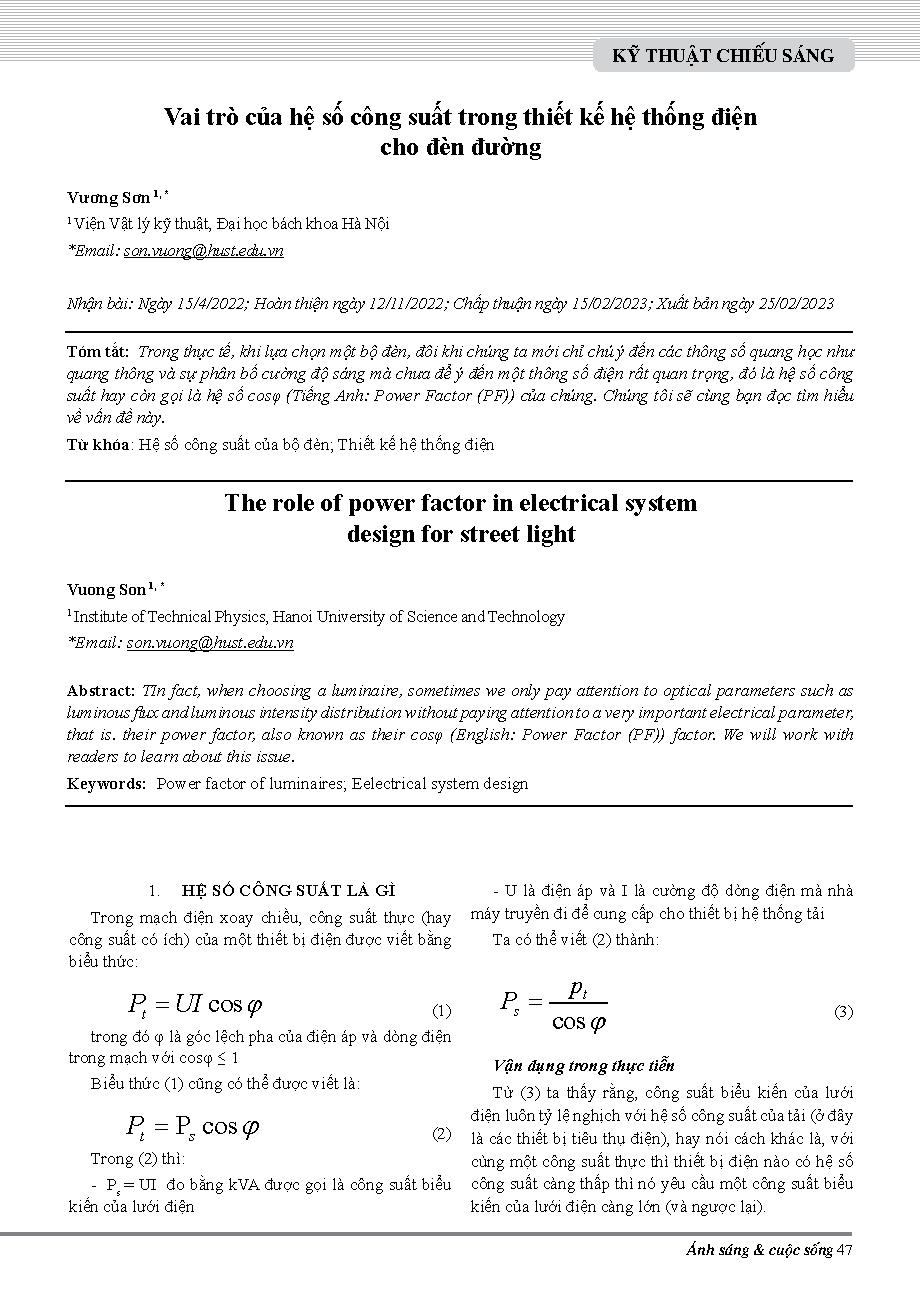 Vai trò của hệ số công suất trong thiết kế hệ thống điện cho đèn đường = The role of power factor in electrical system design for street light