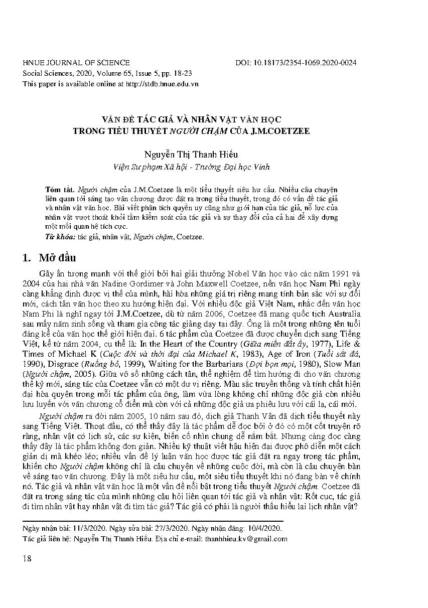 Vấn đề tác giả và nhân vật văn học trong tiểu thuyết Người chậm của J.M.Coetzee = Autho and literary character in Slow Man of J.M.Coetzee