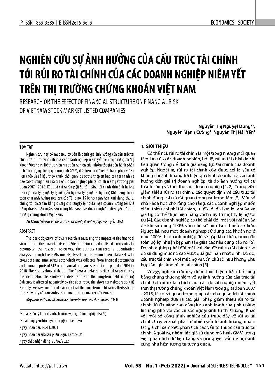 Nghiên cứu sự ảnh hưởng của cấu trúc tài chính tới rủi ro tài chính của các doanh nghiệp niêm yết trên thị trường chứng khoán Việt Nam = Research on the effect of financial structure on financial risk of Vietnam stock market listed companies