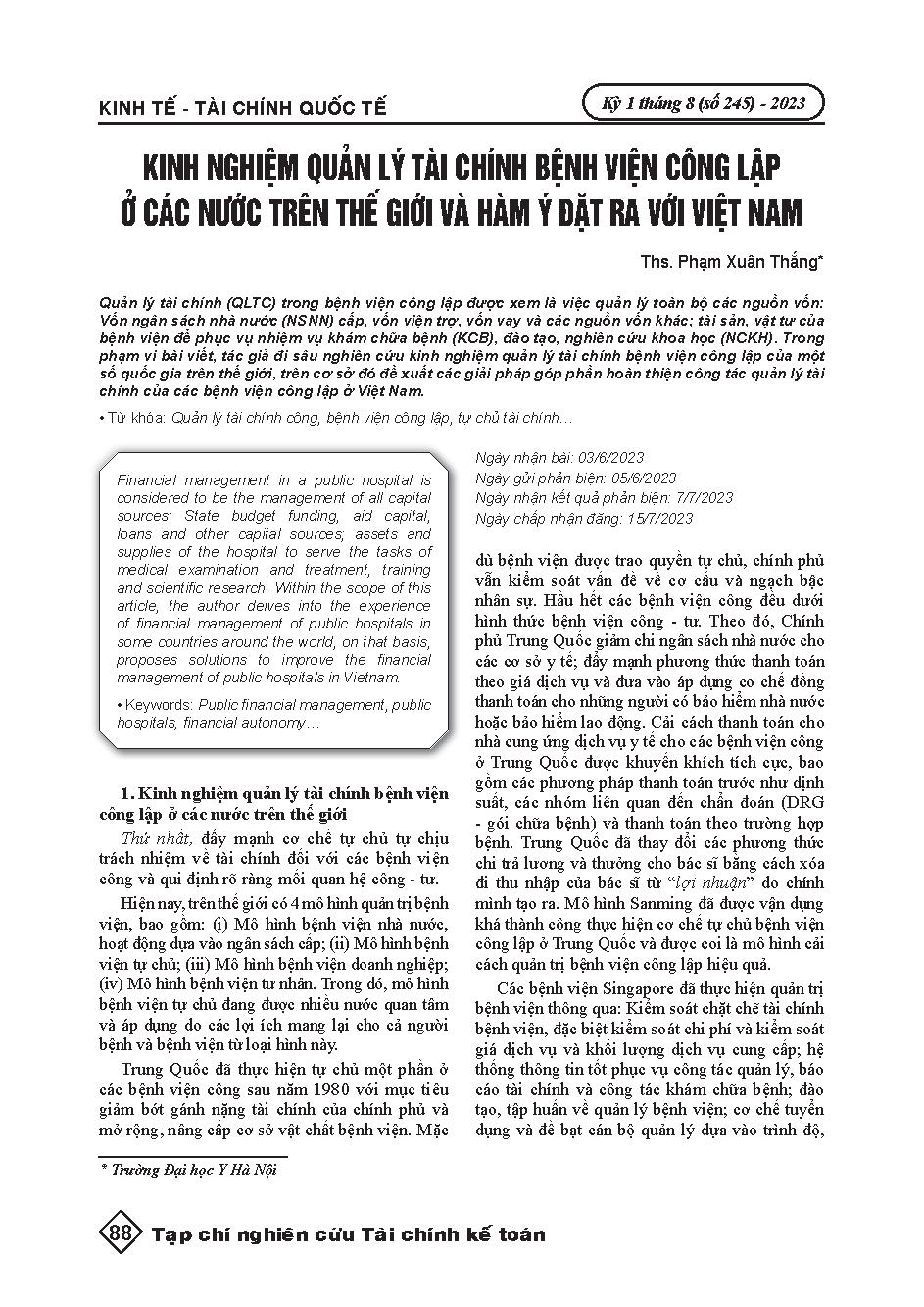 Kinh nghiệm quản lý tài chính bệnh viện công lập ở các nước trên thế giới và hàm ý đặt ra với Việt Nam = Financial management experience in public hospitals in different countries and implications for Vietnam