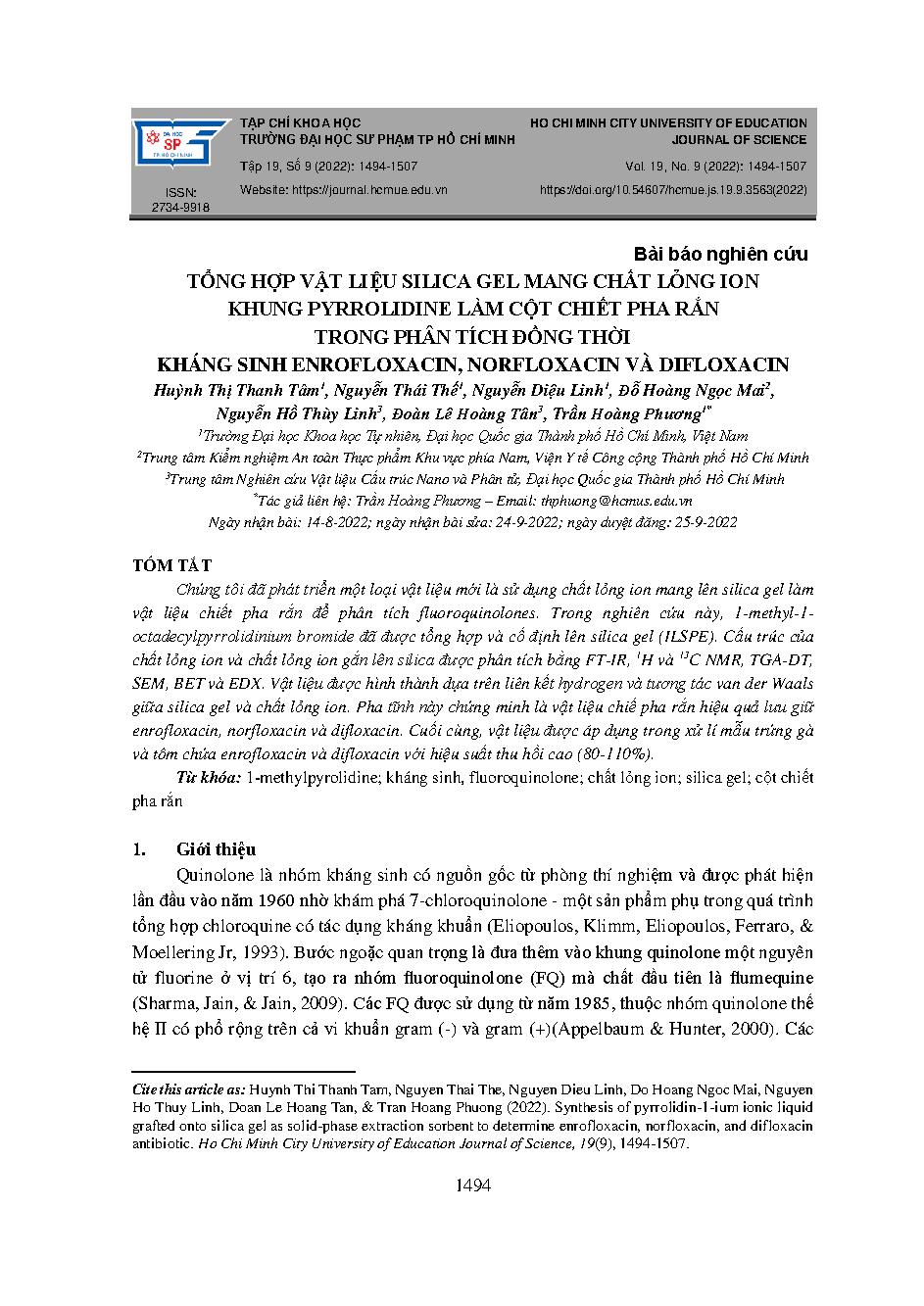 Tổng hợp vật liệu silica gel mang chất lỏng ion khung pyrrolidine làm cột chiết pha rắn trong phân tích đồng thời kháng sinh enrofloxacin, norfloxacin và difloxacin = Synthesis of pyrrolidinium ionic liquid grafted onto silica gel as solid-phase extractio