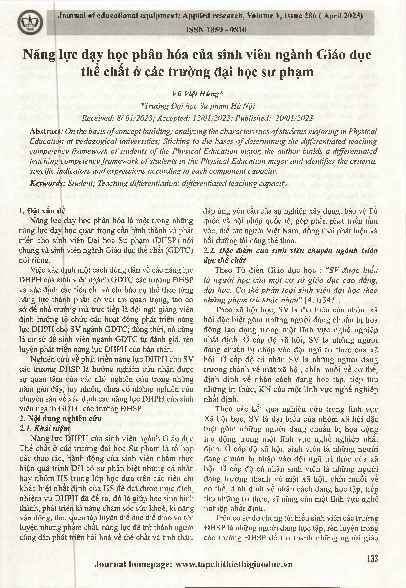 Năng lực dạy học phân hóa của sinh viên ngành Giáo dục thể chất ở các trường đại học sư phạm = Differentiated teaching competence of students majoring in Physical Education at Universities of Education