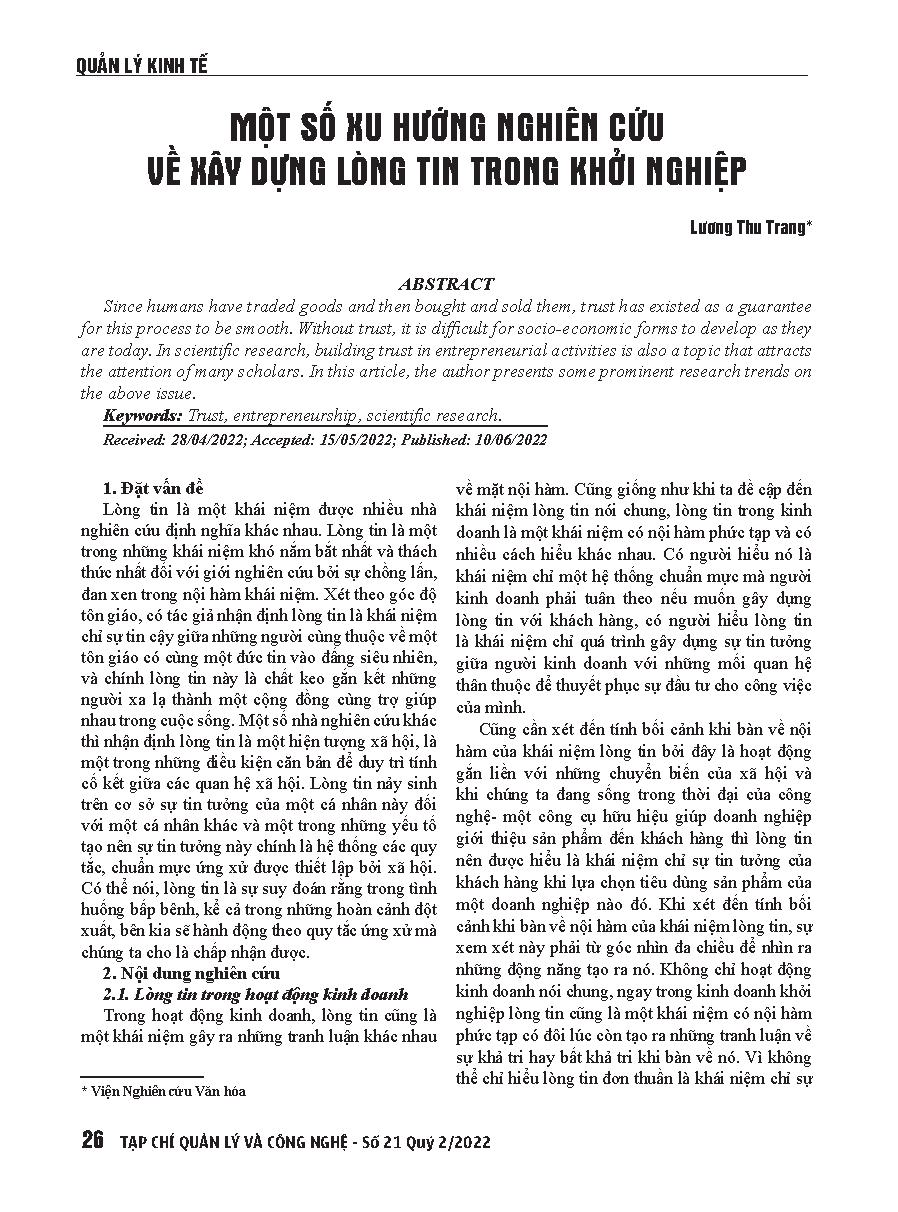 Một số xu hướng nghiên cứu về xây dựng lòng tin trong khởi nghiệp = Some trends of studies on building trust in start-up.