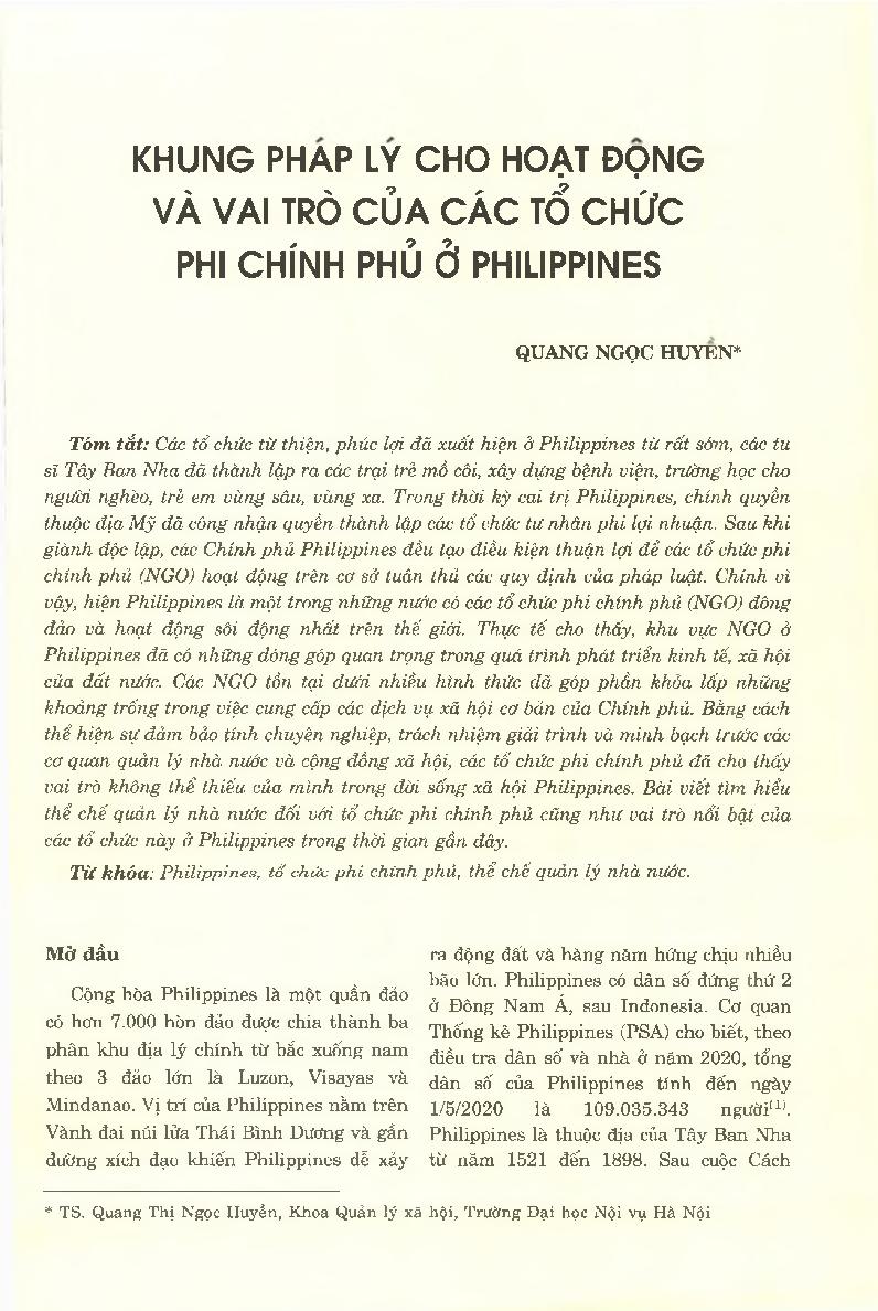 Khung pháp lý cho hoạt động và vai trò của các tổ chức phi chính phủ ở Philippines = Non - Governmental Organizations: Role and Legal Frameworks in the Philippines