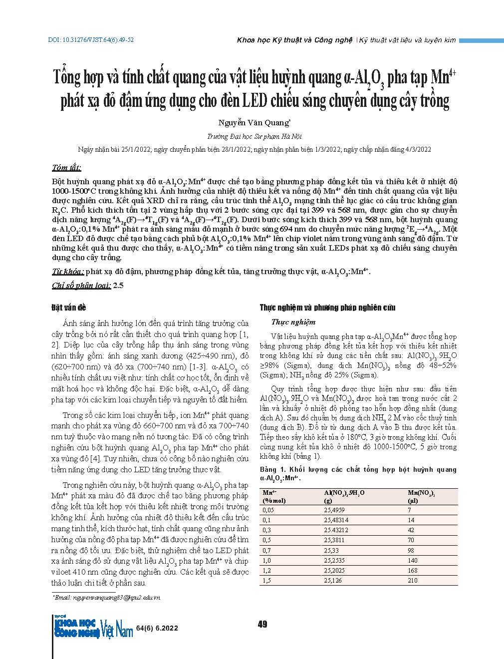 Tổng hợp và tính chất quang của vật liệu huỳnh quang α-Al2O3 pha tạp Mn4+phát xạ đỏ đậm ứng dụng cho đèn LED chiếu sáng chuyên dụng cây trồng = Synthesis and luminescence properties of deep-red emitting Mn4+ doped α-Al2O3 for professional LED grow light