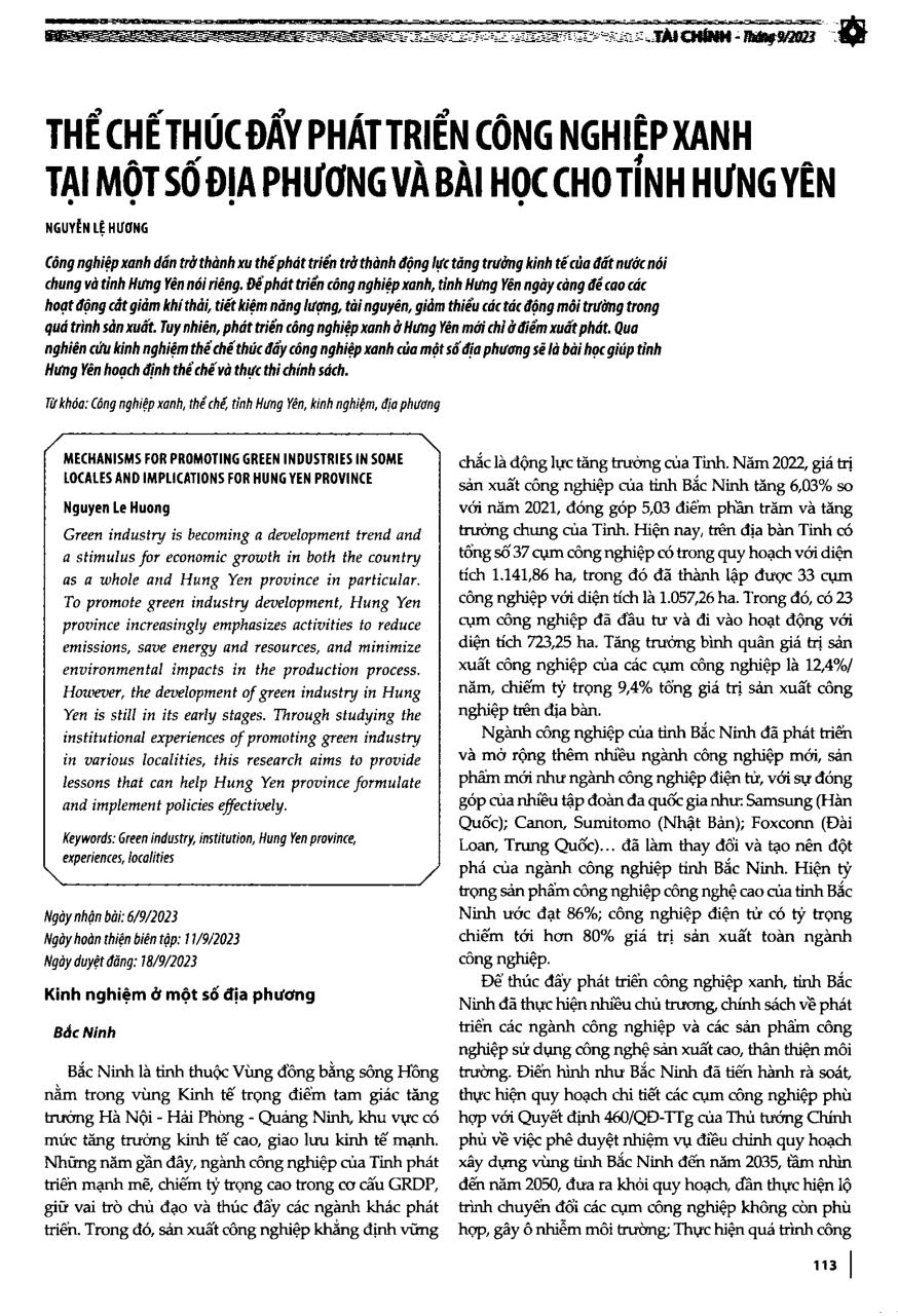 Thể chế thúc đẩy phát triển công nghiệp xanh tại một số địa phương và bài học cho tỉnh Hưng Yên