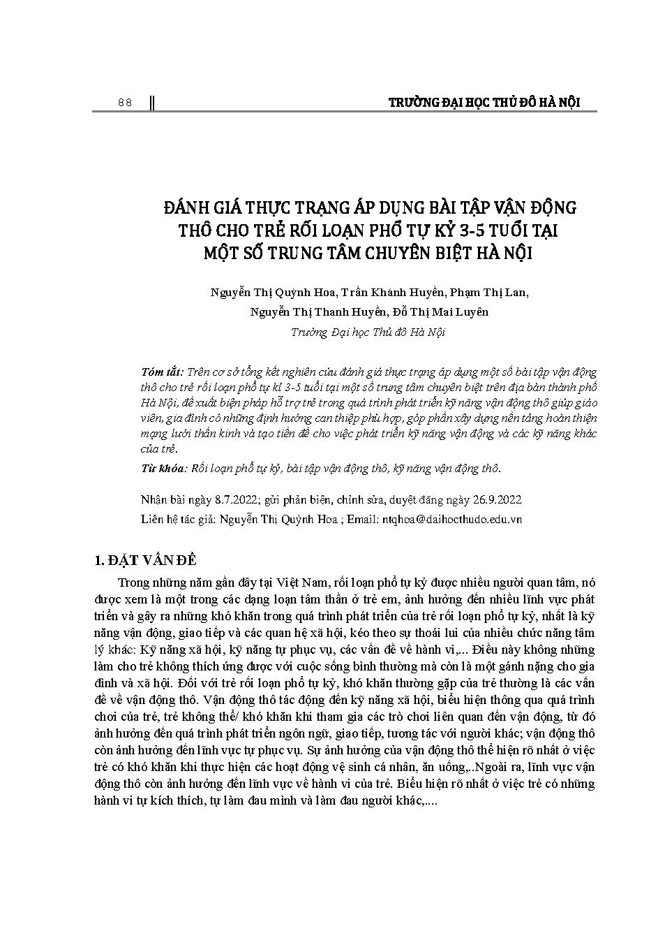 Đánh giá thực trạng áp dụng bài tập vận động thô cho trẻ rối loạn phổ tự kỷ 3-5 tuổi tại một số trung tâm chuyên biệt Hà Nội = Assessingthe situation of applying gross motor exercises for children with autism spectrum disorders aged from 3 to 5 years old