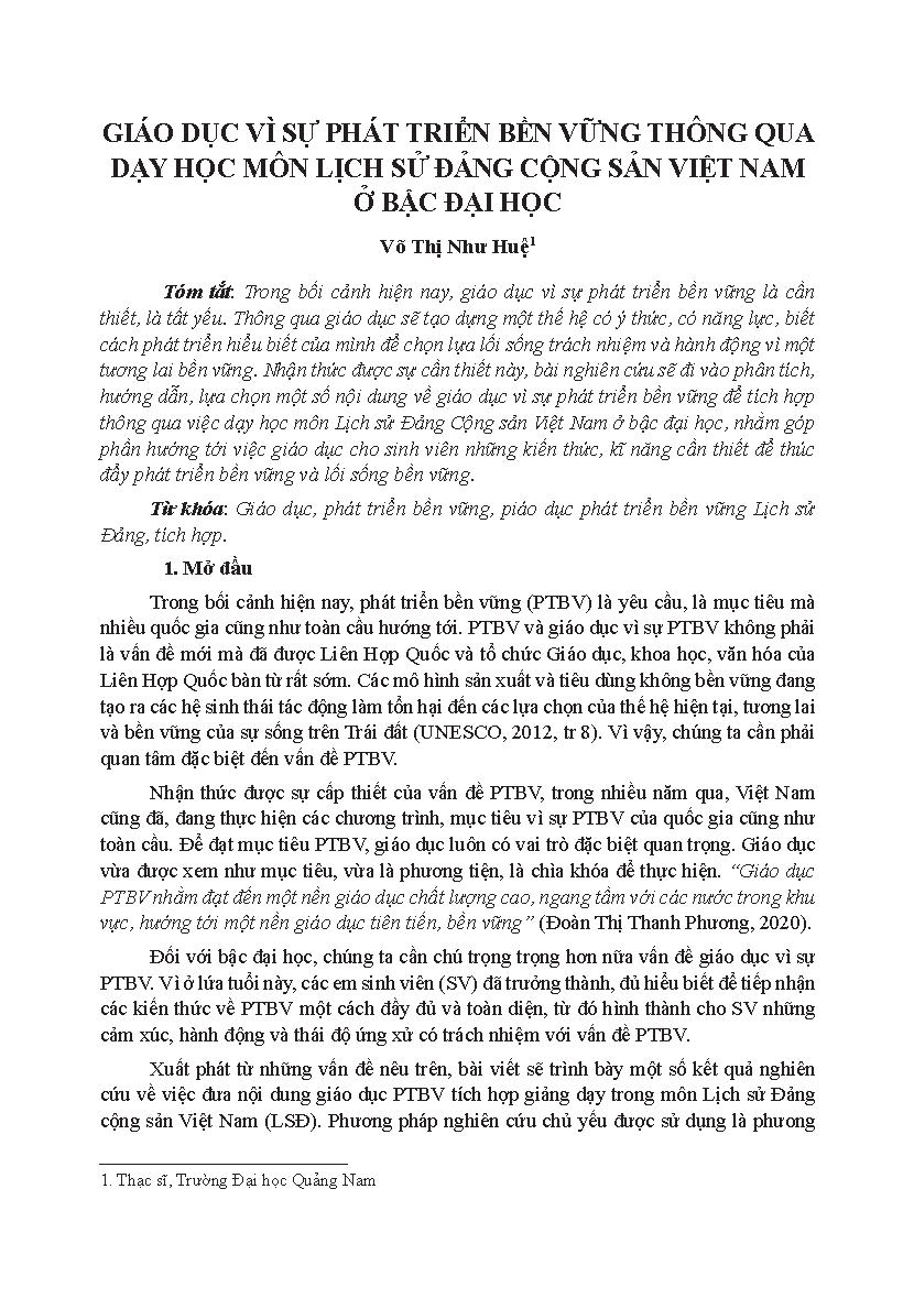 Giáo dục vì sự phát triển bền vững thông qua dạy học môn Lịch sử Đảng Cộng sản Việt Nam ở bậc đại học = Education for sustainable development through teaching the history of the Vietnam communist party at tertiary level