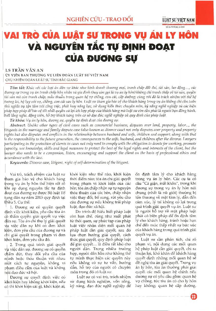 Vai trò, của luật sư trong vụ án ly hôn và nguyên tắc tự định đoạt của đương sự = Roles and responsibilities of lawyers in divorce cases and the principle of self-determination of the litigants