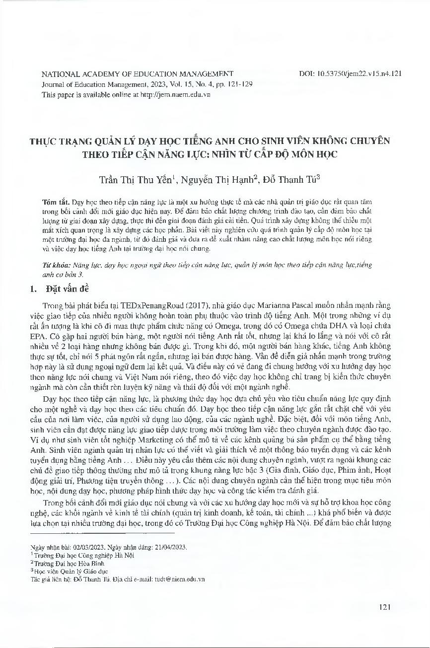 Thực trạng quản lý dạy học tiếng Anh cho sinh viên không chuyên theo tiếp cận năng lực: nhìn từ cấp độ môn học = Management of competency-based english teaching: the module level management