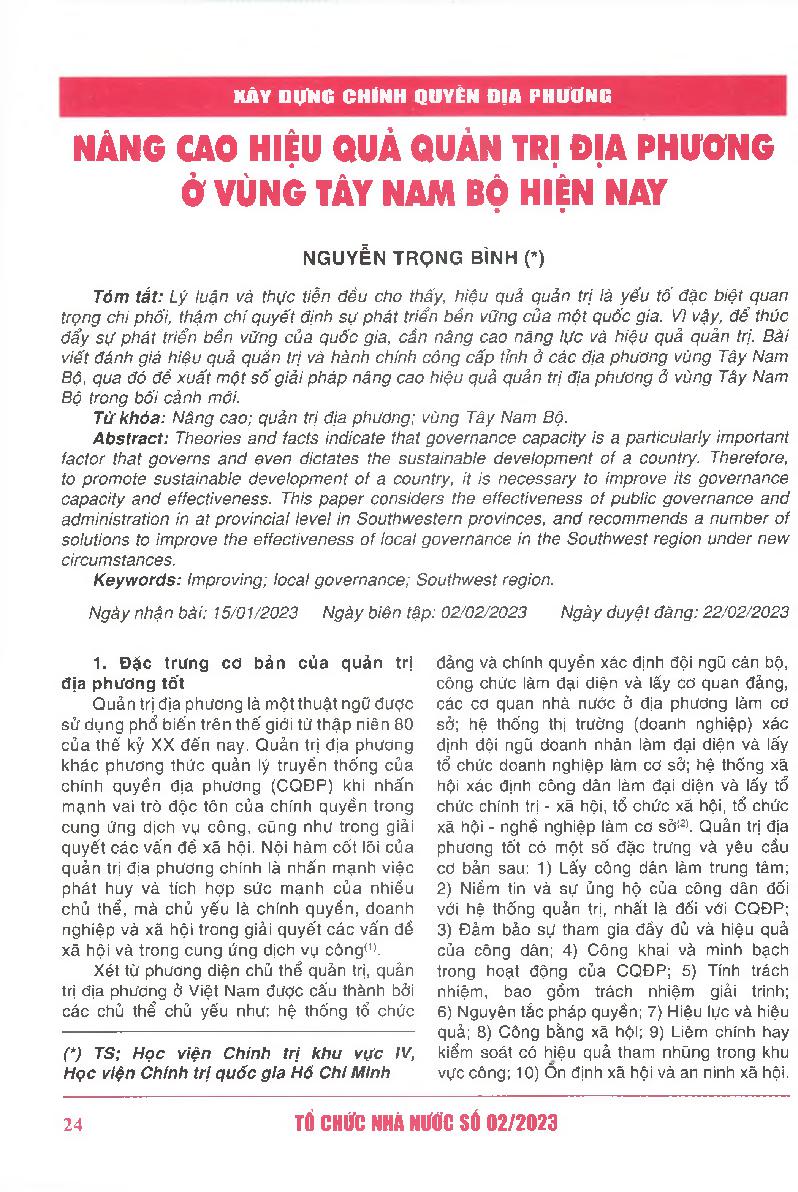 Nâng cao hiệu quả quản trị địa phương ở vùng Tây Nam Bộ hiện nay = Improving the effectiveness of existing local governance in the Southwest region