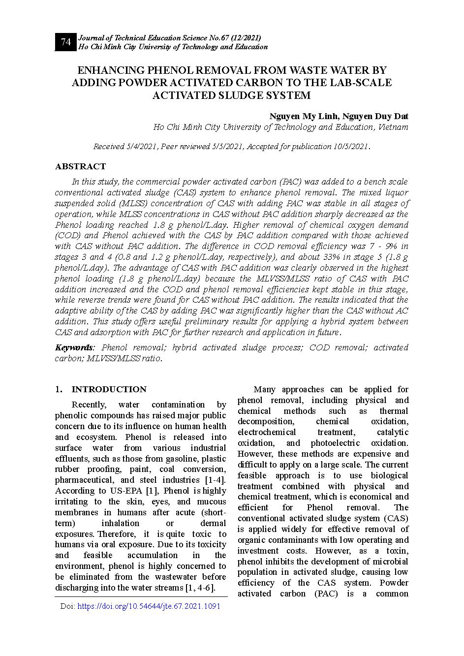 Loại bỏ phenol khỏi nước thải bằng cách thêm than hoạt tính dạng bột vào hệ thống bùn hoạt tính quy mô phòng thí nghiệm